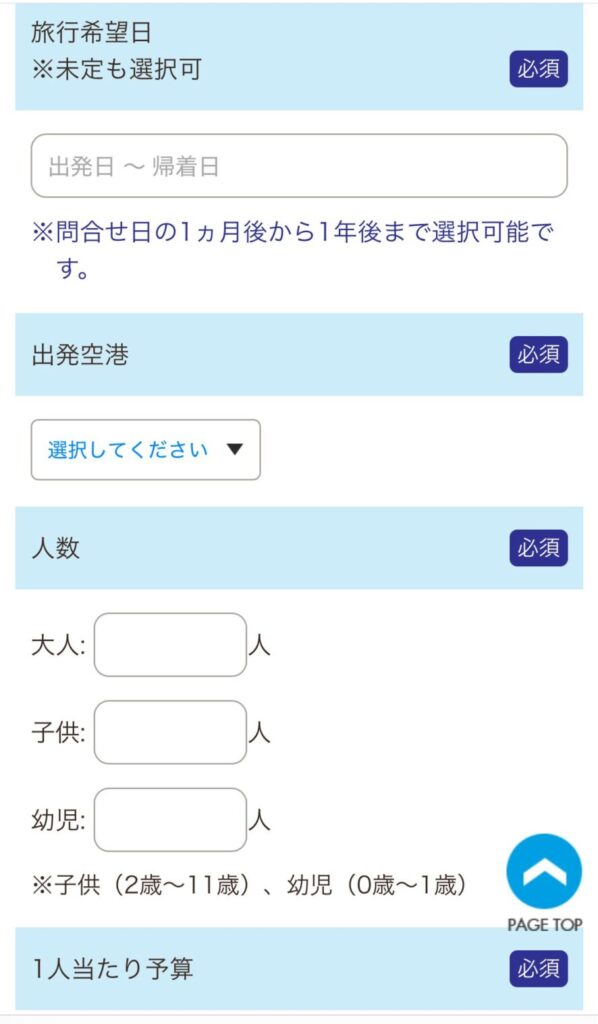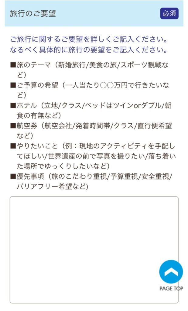 航空券のクラス、ホテルのベッドの数、絶対に見たい観光スポットなど、思いつく限りの希望を具体的に書いておくと、より希望に合うプランで見積もりを取ることができます。