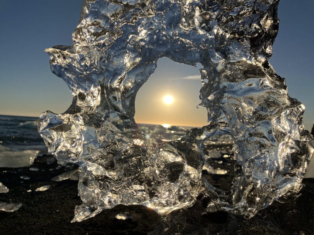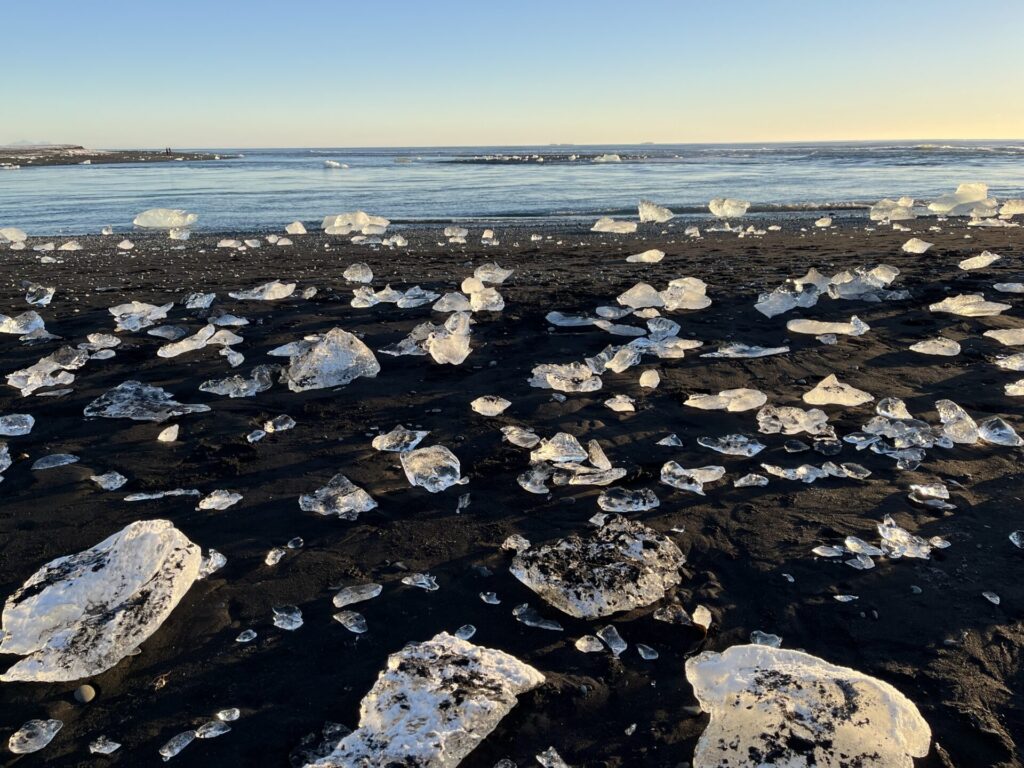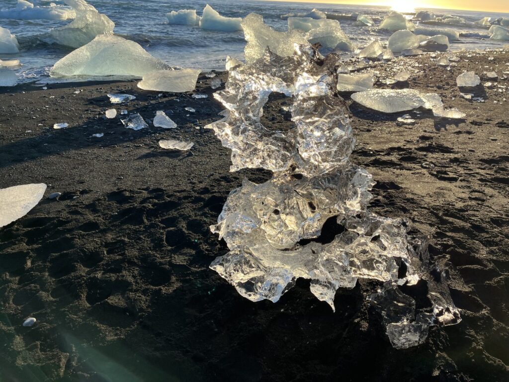 40分休憩の後は、再びバスに乗り込み、ヨークルスアゥルロゥン氷河湖と、すぐ近くのダイヤモンドビーチへ。ダイヤモンドビーチには、ヨークルスアゥルロゥン氷河湖から流れた氷山の一部が氷の塊として打ち上げられているのですが、これが太陽の光でキラキラ輝いて、現実とは思えない程美しい光景が広がります。