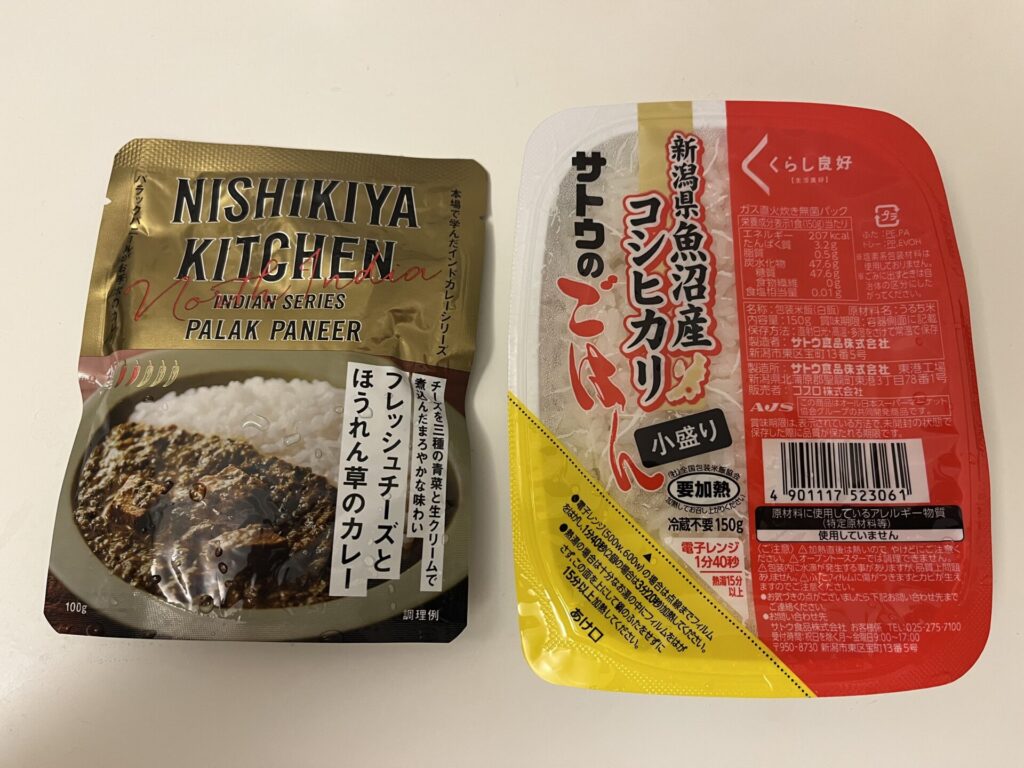 今回使うのは、サトウのご飯(150g)と、にしきや のレトルトカレー↓
