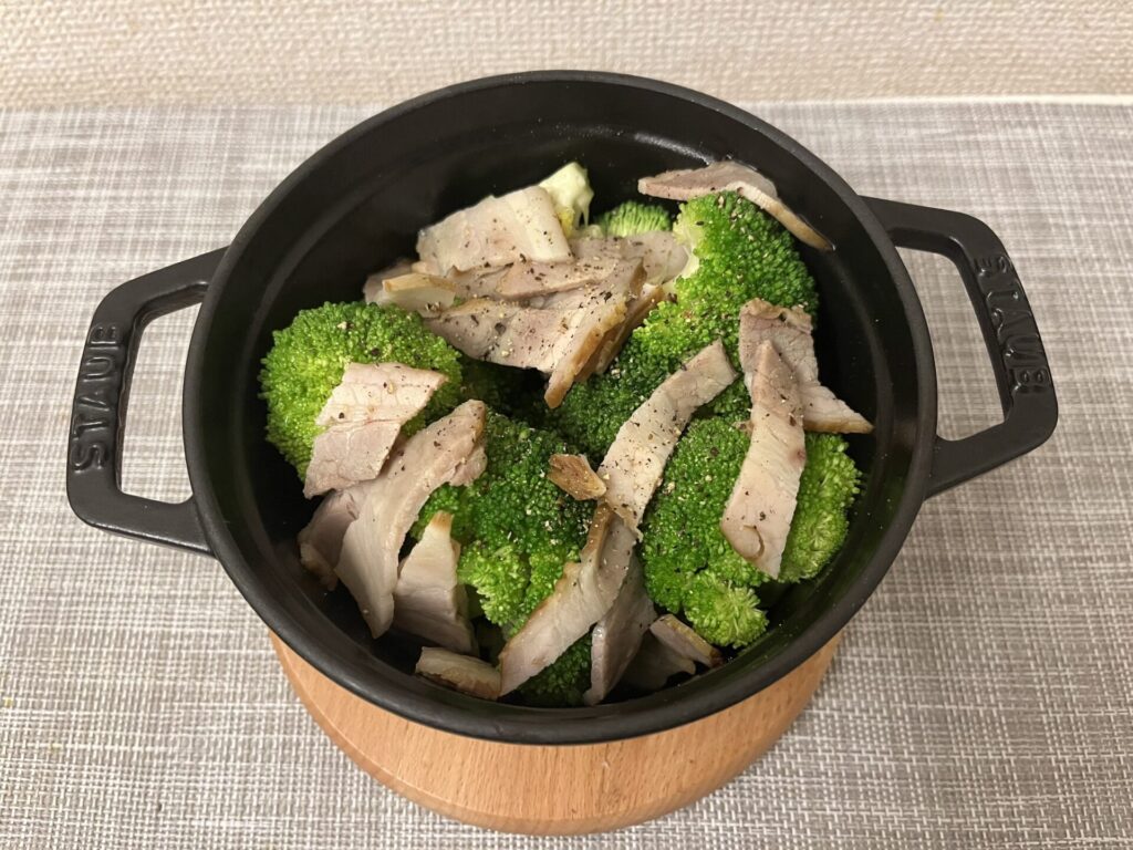 ①ブロッコリーを洗ってカットしたものを、STAUBに入れる