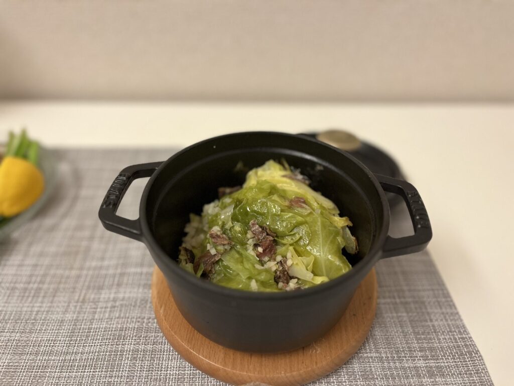 ①STAUBにキャベツを入れる(ぎゅうぎゅうでOK)