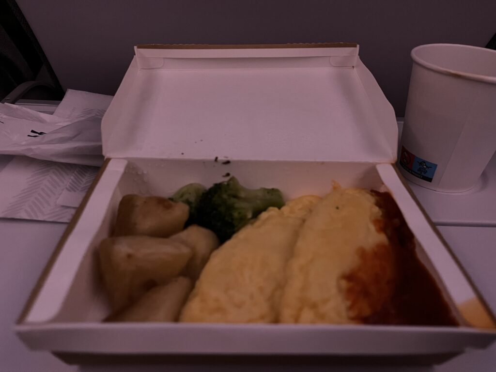 着陸2時間前に朝食としてオムレツが提供されましたが、これがとても美味しかったです↓